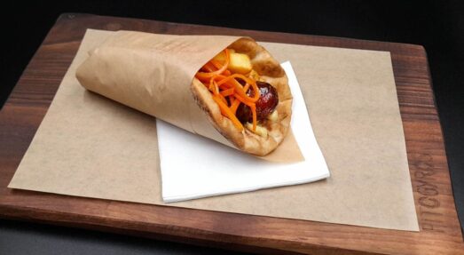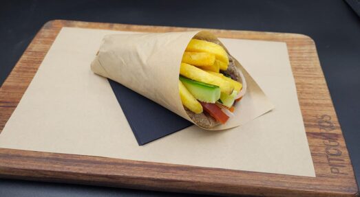 ✓ vegan in carob bread pita with tomato, cucumber, onion, olive paste, hummus, chilly and fresh fried potatoes 5,80€