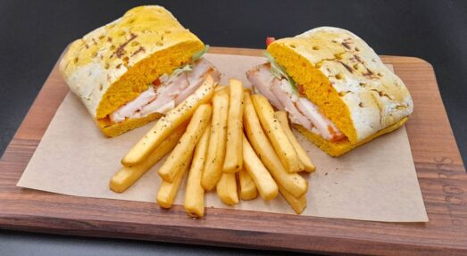 ✓ smoked chicken in traditional bread, ceasar`s sauce, iceberg, tomato, parmesan flakes, fresh fried potatoes 17,90€