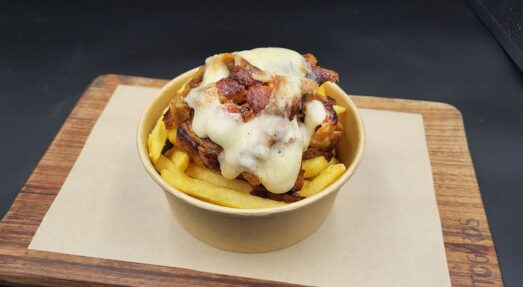 ✓ Fresh fried potatoes, gyros chicken on top with mustard sauce & parmesan cream on top 14,20€