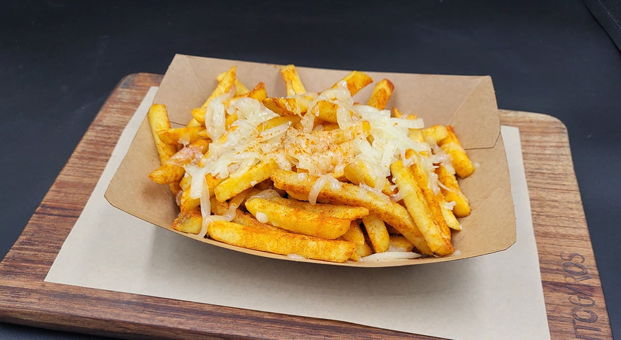 ✓ Fresh fried potatoes, gyros pork on top with paprika sauce & gruyere cheese 14,20€