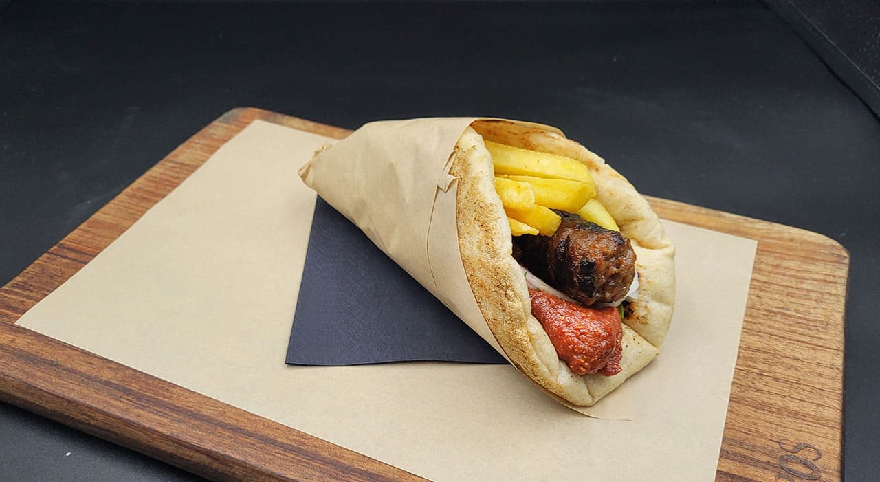 ✓ pork souvlaki, tzatziki, tomato, onion & fresh fried potatoes 6,70€